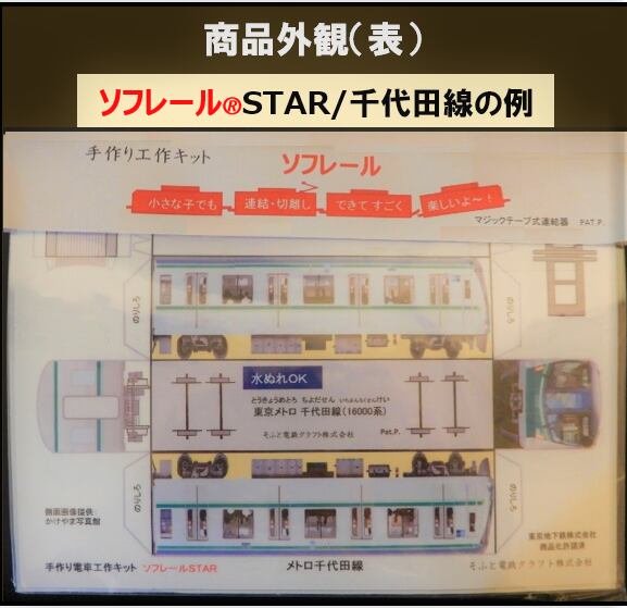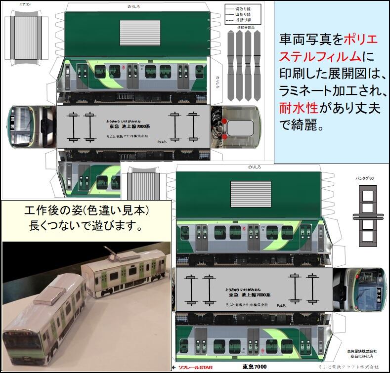電車写真を耐水フィルムにカラー印刷した展開図をラミネート加工(耐水性)、連結器・芯材付き
